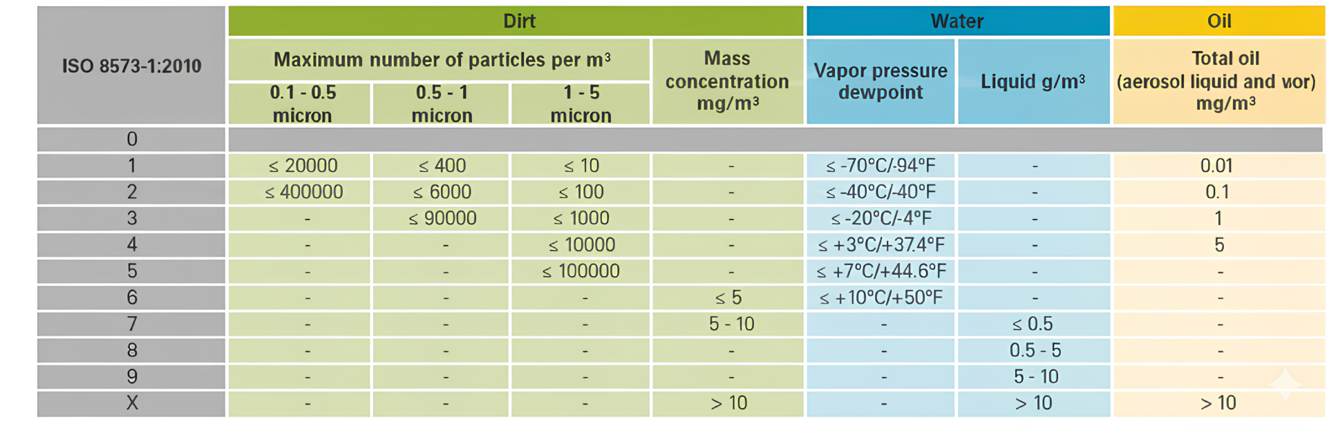 Compressed air contains contaminants such as water, oil and particulates which must be removed or reduced to the acceptable level based on specific application requirements. Standard ISO 8573-1 specifies air purity/quality classes for these contaminants. Humidity (water vapour content) is expressed in the terms of Pressure Dew Point (PDP) where Dew point is the temperature at which air is 100% saturated with moisture.